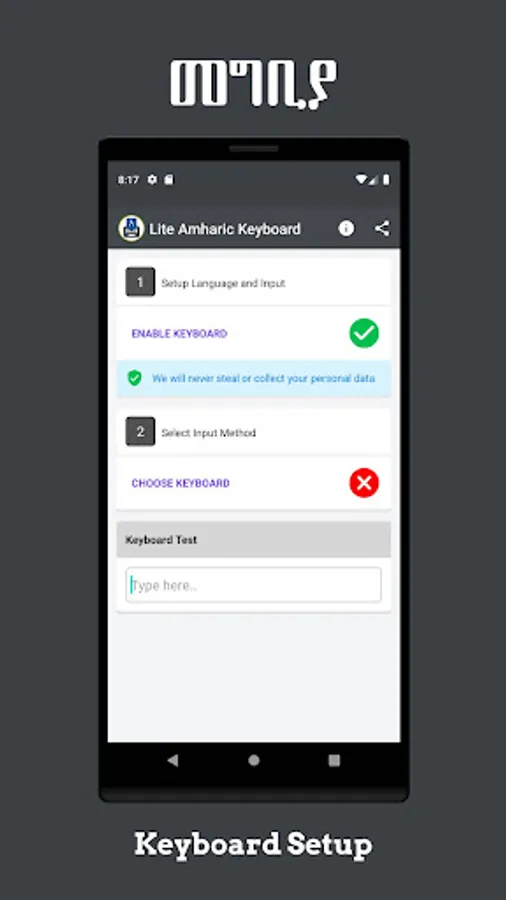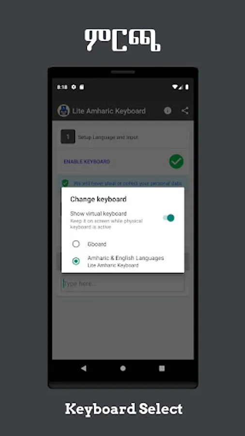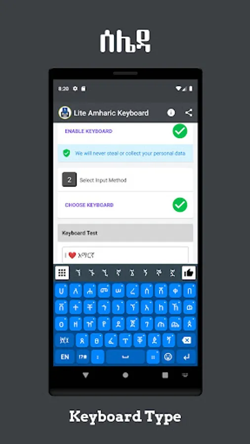 However, you may receive a warning when activating Lite Amharic Keyboard saying “This keyboard may collect your personal data.” The warning message is a standard message in Android for ANY third-party keyboard app, so feel safe.