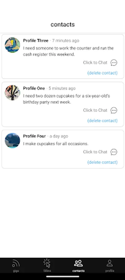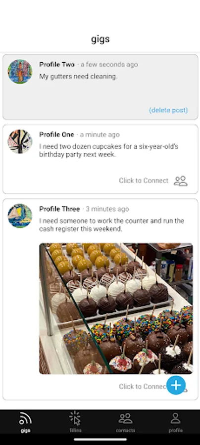 Here’s how it works. Users post the gigs they are offering and other users in the network (fillins) select the ones they’d like to fill. It’s that easy.