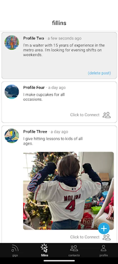 Fillin is a mobile app designed to connect app users looking for gigs to fill (fillins) with users who have gigs to offer.