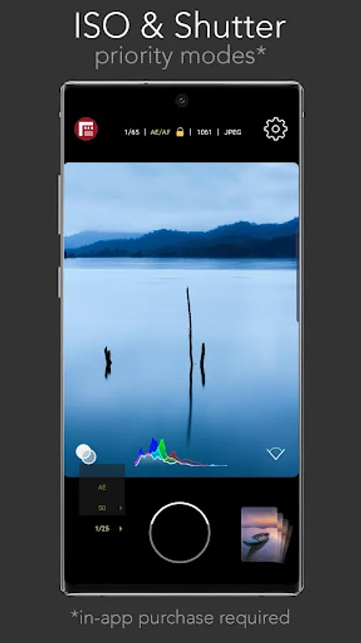 - Shutter and ISO priority modes: In addition to AE you can set specific Shutter Speed or ISO values to adhere to and let the app automatically adjust exposure for the unlocked value.