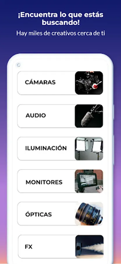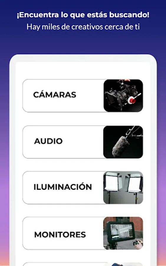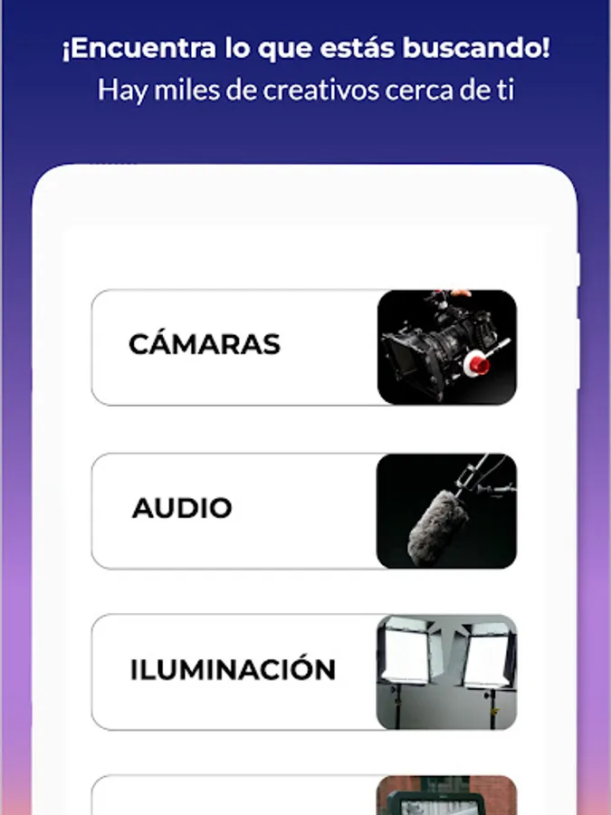 Filmo is the reference platform for filmmakers, photographers and production companies. Download the app and find professionals near you who rent cameras, optics, lights, sound equipment and/or any type of material you need for your next audiovisual project.