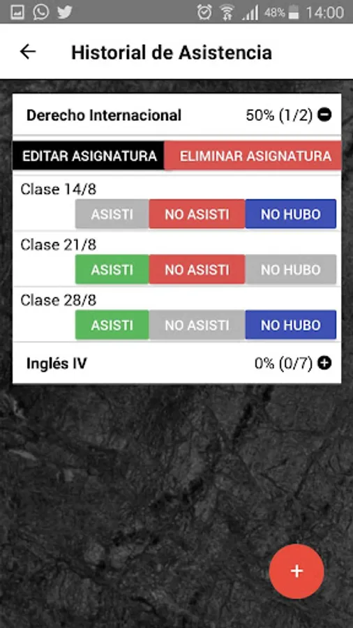 With the daily attendance record, the application calculates the percentage according to the absences and assistance you have per day, which will provide you with a frame of reference that will help you to know when you are at risk.