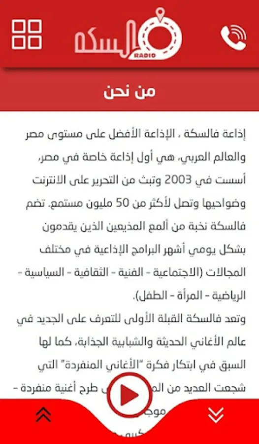 Radio Falska, the best radio station in Egypt and the Arab world, is the first private radio station in Egypt. It was founded in 2003 and broadcasts from Tahrir on the Internet and its environs, reaching more than 50 million listeners. Falseka includes a group of the brightest broadcasters who present on a daily basis the most famous radio programs in various fields (social - artistic - cultural - political - sports - women - children).