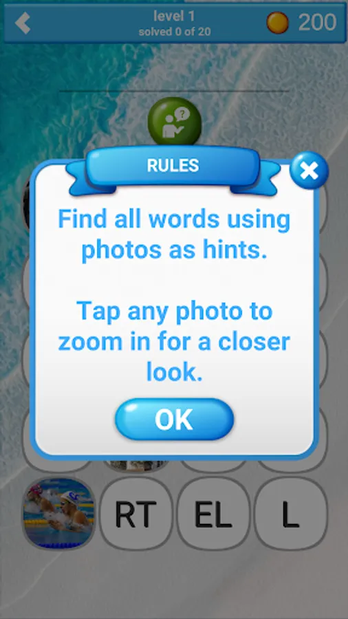 About 20 pictures are available to you at each level, your task is to guess all the words that are hidden in the photos. Use hints if you can't guess the word.