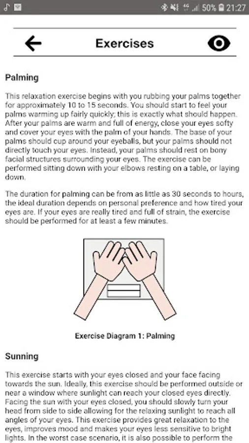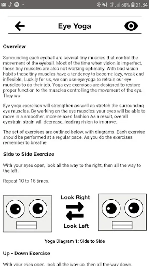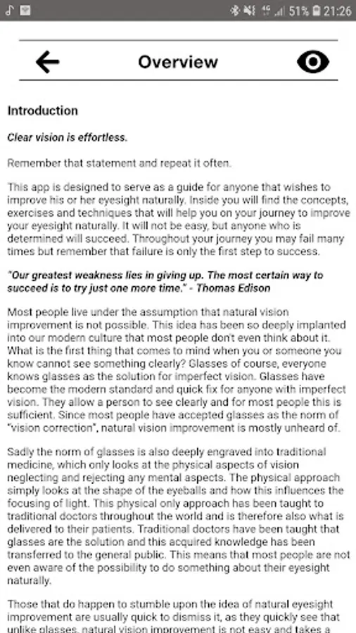 While most apps focus on merely eye exercises or only one part of vision correction, this app looks at all the aspects of natural vision correction. To achieve 20/20 vision, one must fully understand correct vision habits and employ them daily. Doing a set of eye exercises without understanding the core principles of healthy vision is not enough.