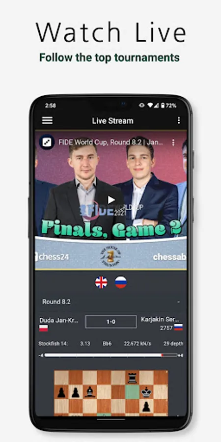 Follow the games of the strongest grandmasters LIVE with simultaneous cloud analysis by Stockfish 14 and LCZero. Get notified about the top events (like the World Chess Championship or FIDE Candidates) before their start.