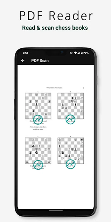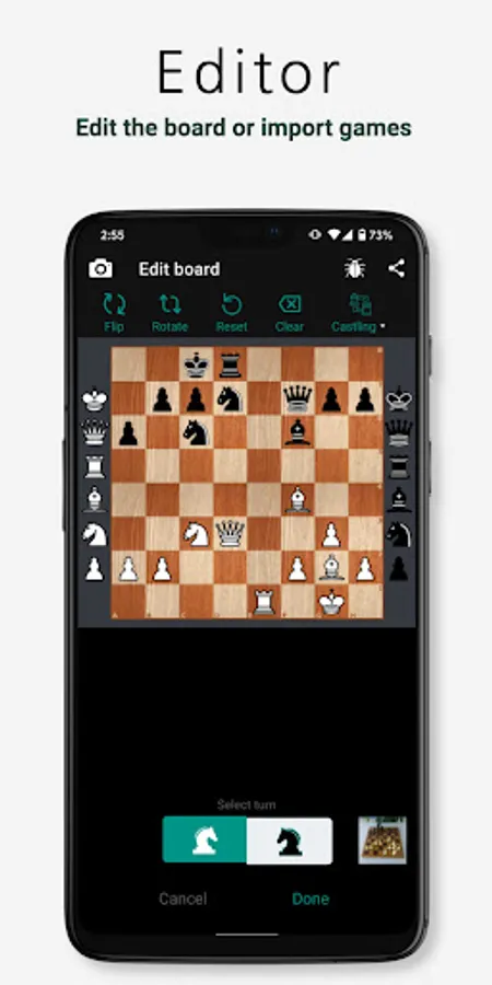Take a photo of a real chessboard to get its digitized version on your phone or scan chess puzzles from printed or digital sources with 99% accuracy.