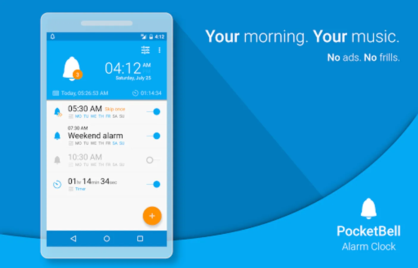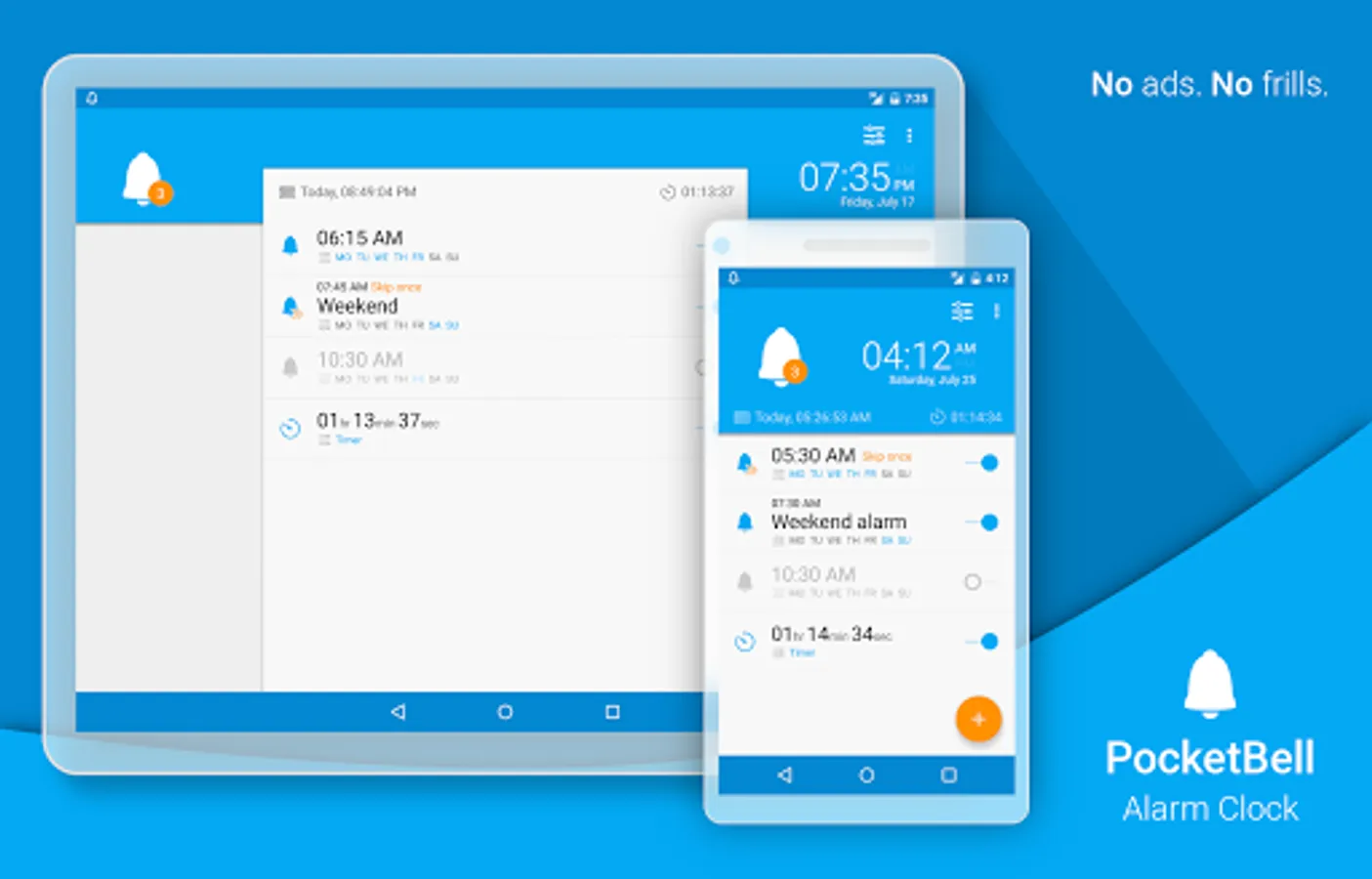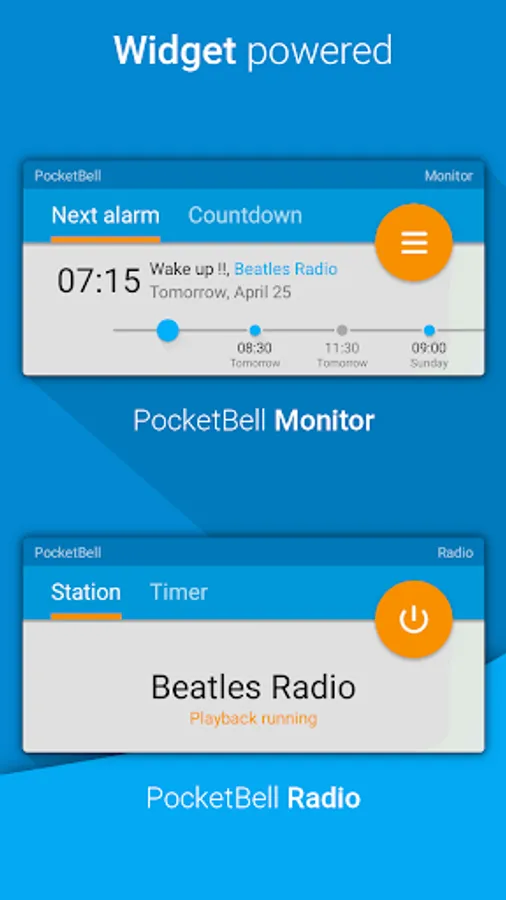 PocketBell Monitor the alarm-timeline widget provides a clear view on your upcoming alarms as well as it offers the opportunity to activate / deactivate or skip alarms right from your homescreen. Take a look at the next alarm countdown any time you please.