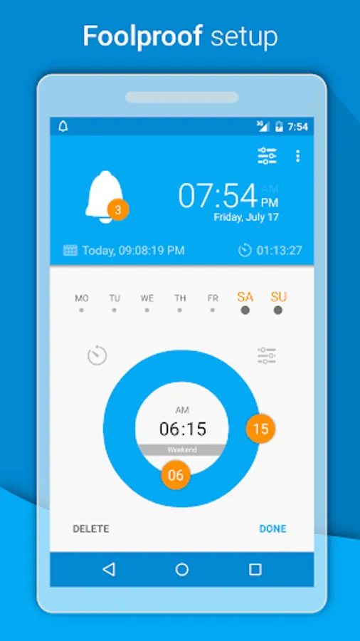 An intuitive and easy alarm setup with simple gestures allows setting up alarms in seconds.