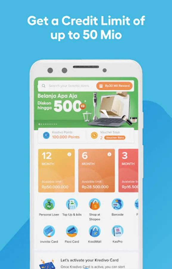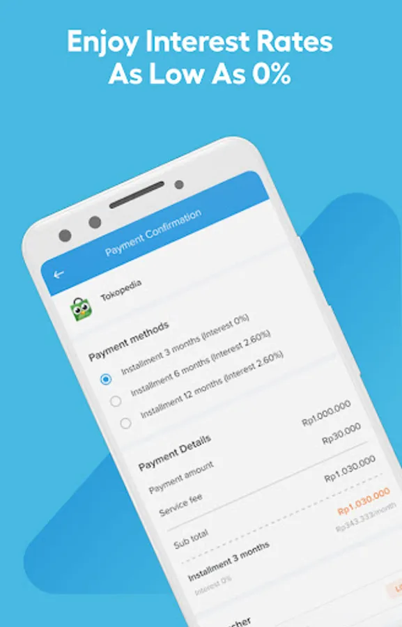 Kredivo is an award-winning app (Google Play Best Apps of 2017) that evaluates your creditworthiness in real-time. The registration process is just 5 minutes and approval is given in a few hours. If approved, you can directly shop online on installment using Kredivo “buy now and pay later” on Tokopedia, Lazada, Bukalapak, Tiket.com, Erafone, Best Denki, Electronic City, IKEA, McDonald's and 3000+ other merchants with just 2 clicks.