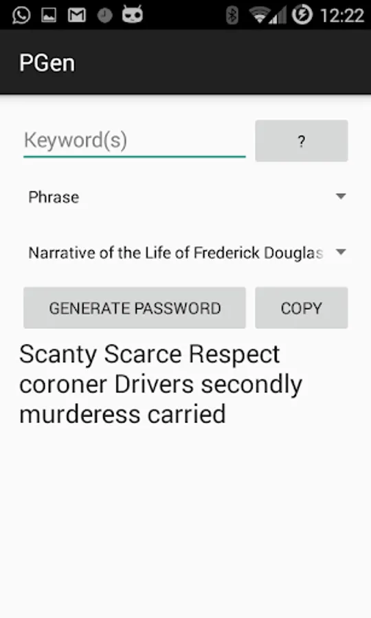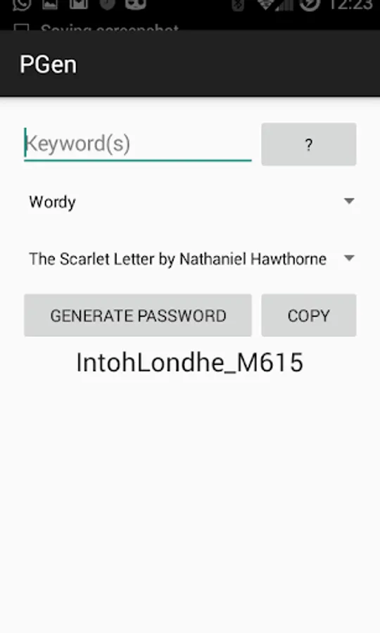 PGen is a utility for generating unique passwords. No password data is stored on your device and the password/keyword combinations are unique to your android device.