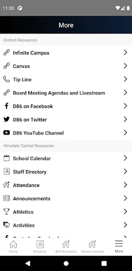 The Hinsdale District 86 app provides students, staff, families and community members with all the information they need in one place. It includes: