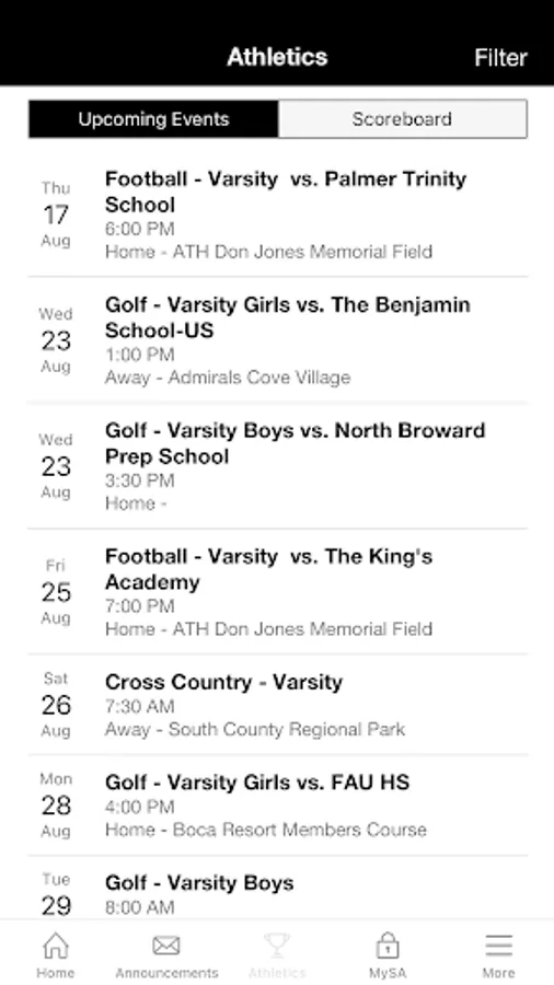 - Review athletic event details, including opponents, game results, recap commentaries, and more