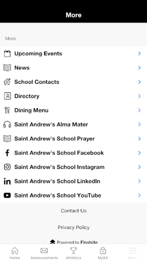 The information presented in the Saint Andrew's School app is drawn from the same source as the Saint Andrew's School website. Privacy controls restrict sensitive information only to authorized users.