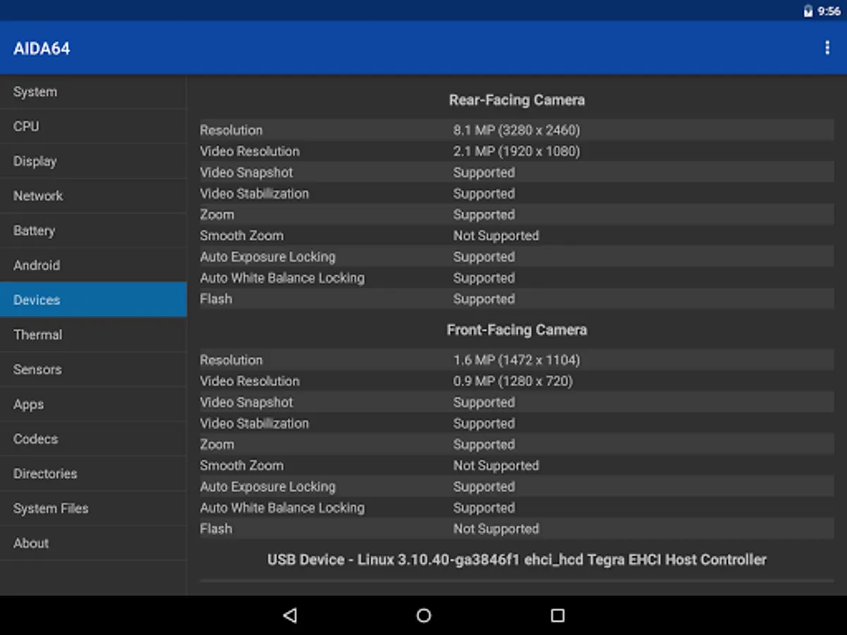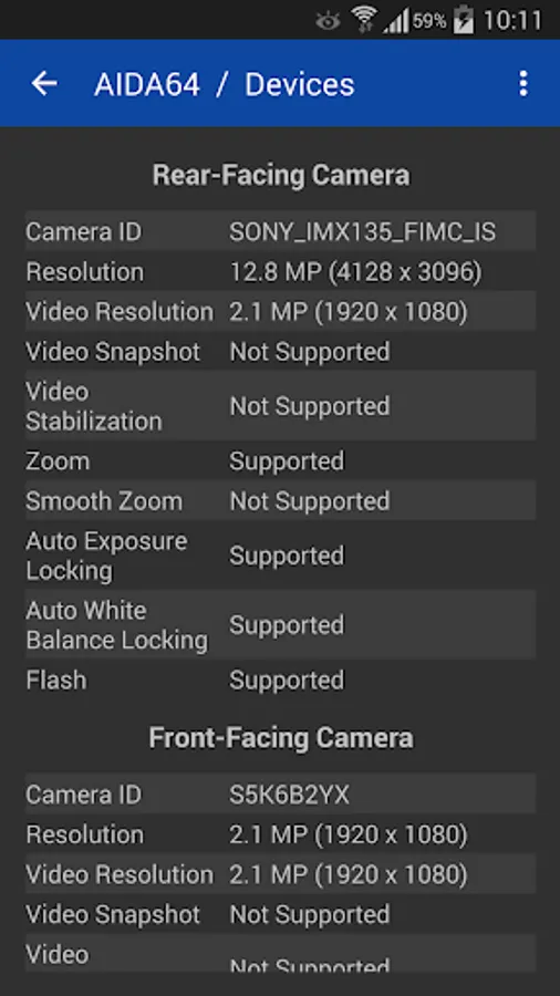 - Camera capabilities may show incorrect information if the manufacturer encoded the wrong values into the Android profile of the device. If you find misreported information on the Devices page, please send us the report of your device from the About page, and we will fix it up in the next AIDA64 app update.