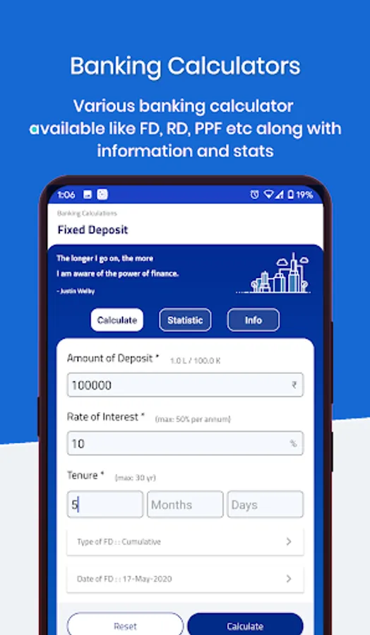 4. The banking calculation section consists of interest calculators on financial instruments like Fixed Deposit (FD calculator), Recurring Deposit (RD calculator), Public provident fund (PPF calculator) & Systematic Investment Plan (SIP calculator / Mutual Funds calculator).