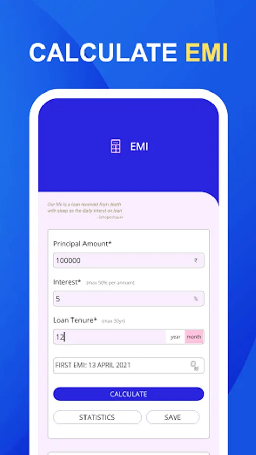 With our EMI Calculator, you can perform all kinds of EMI's like Bike Loan EMI, Mobile EMI, Car Loan EMI, Home Loan EMI......etc.We can do EMI calculations from Bajaj Finance App, HDFC Loan APP, SBI Loan App, It doesn’t matter which loan provider you choose. Just enter the loan amount the interest rates and the loan tenure and tap calculate. Our Latest EMI calculator app will do the calculations and give you the proper results which include: