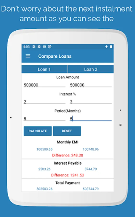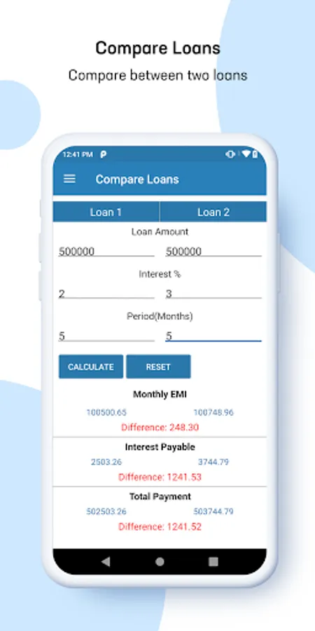 Thus Easy EMI calculator app is a must-have for anyone looking to take a loan, be it for a car, home, education, or personal expenses. This app makes it easy for you to calculate your monthly installments and make informed financial decisions. With features like the ability to compare two loans, a graphical representation of the loan tenure, instant generation of statistics charts, a GST calculator, and more, an easy EMI calculator app is a comprehensive tool for financial planning and budgeting. Whether you're an individual or a financial planner, this app is perfect for you. So, make the smart choice and download the emi calculator app today!