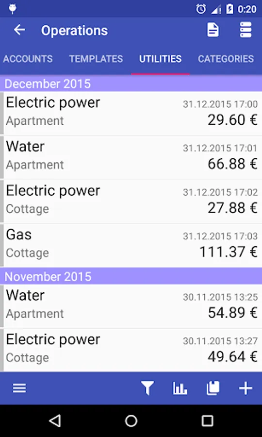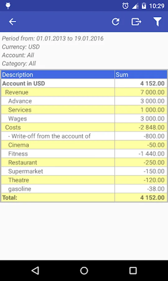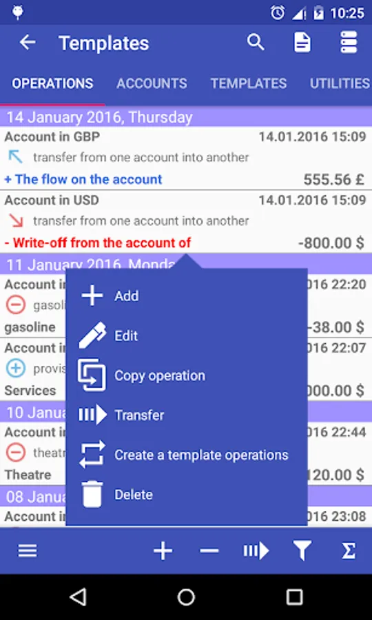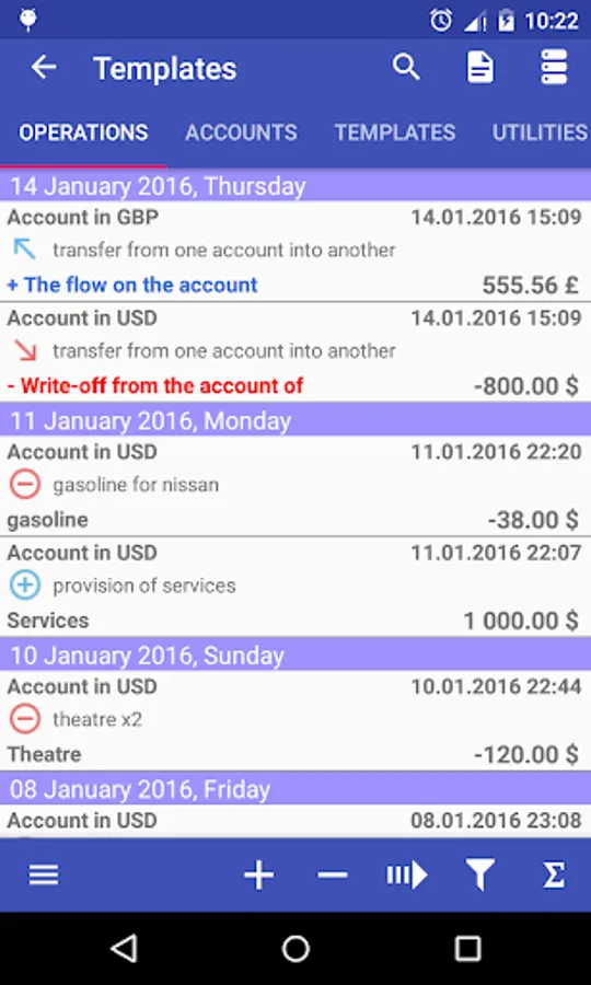 7. The possibility of selection of operations by date, accounts, categories, currencies.