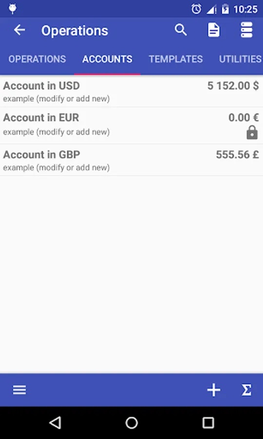 2. Keeping the directory of accounts in different currencies, displaying the balance.