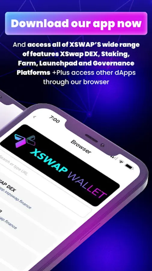 It gives the user the ability to interact with various distributed apps. In the main screen, user can send and receive funds, and monitor their tokens. Through the web browser, users can connect to dApps, with XSwap Protocol AMM DEX, staking, launchpad, farming and governance platforms as defaults, to stake, swap, add liquidity pools, farm LP pools and tokens and access the launchpad and governance platform. XSwap wallet also comes with Wallet Connect which allows the user to easily connect their wallet to dApps and Web3 apps by scanning a QR code.