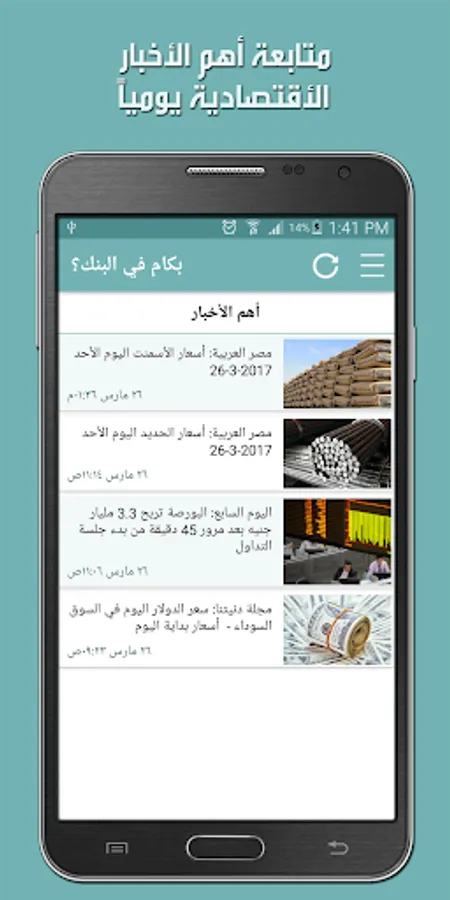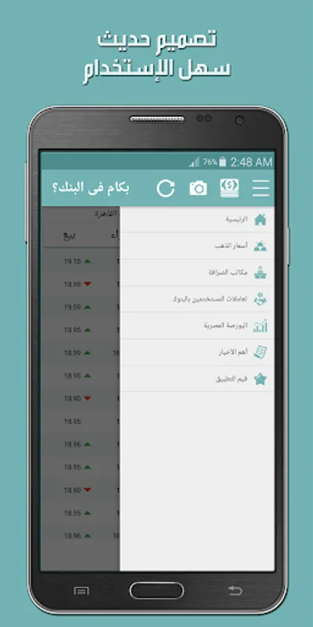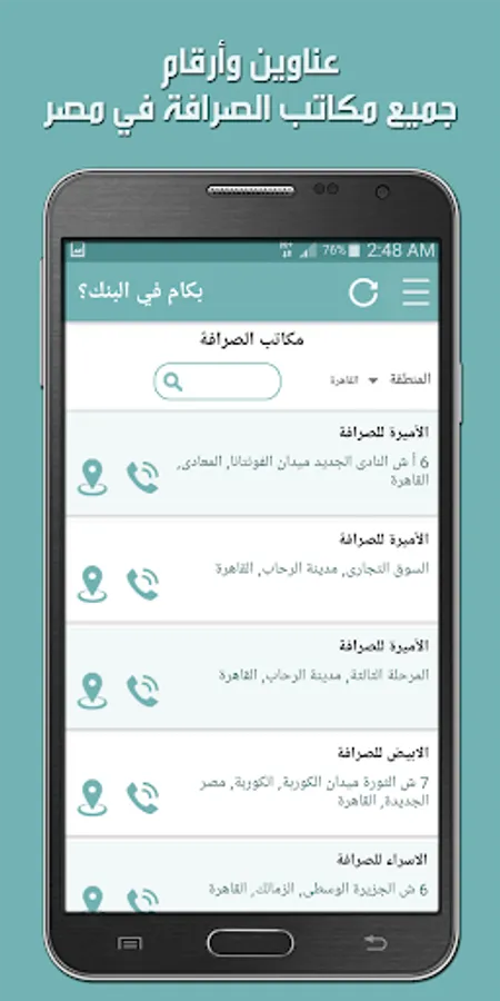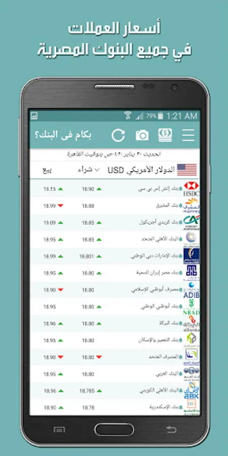 Bkam in the bank is an easy to use application, all you need is to choose the currency to know the rates in the various Egyptian banks, currency rates are automatically collected from the official sources of the various Egyptian banks and displayed easily and quickly. Prices are updated every minute and results can be sorted by purchase or sale price, descending or ascending.