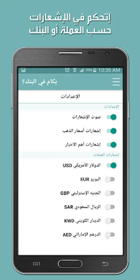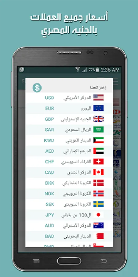 The application includes all foreign currencies: US Dollar - Euro - British Pound - Saudi Riyal - Kuwaiti Dinar - UAE Dirham - Swiss Franc - Canadian Dollar - Danish Krone - Norwegian Krone - Swedish Krona - Japanese Yen - Australian Dollar - Bahraini Dinar - Omani Rial - Qatari Riyal - Jordanian Dinar - Chinese Yuan.