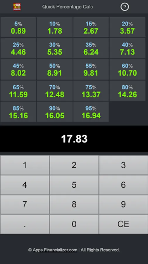 Quickly see a particular amount's percentage — using this handy and simple, yet very helpful app. E.g. 8%, 15%, 30% etc in a glance. Especially useful for giving tips, or group ordering, or shopping taxes etc.