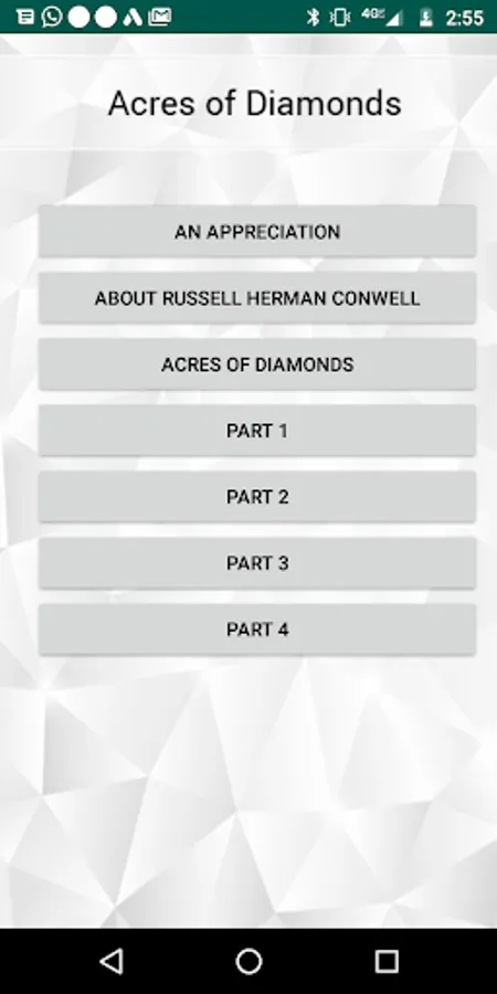 In Acres of Diamonds, Russell Conwell shows that success is a spiritual idea. Acres of Diamonds is based on a speech given to raise money for what would become the Temple University. This app comes with the entire e-book, completely free of charge.