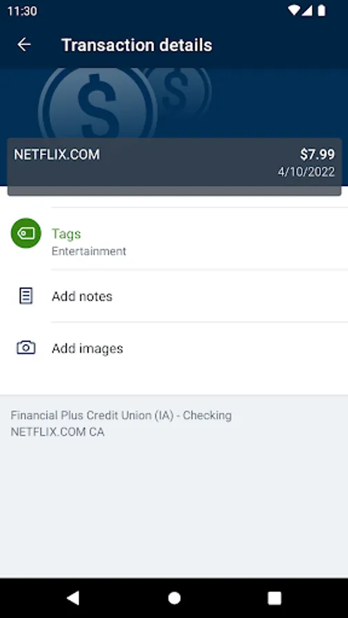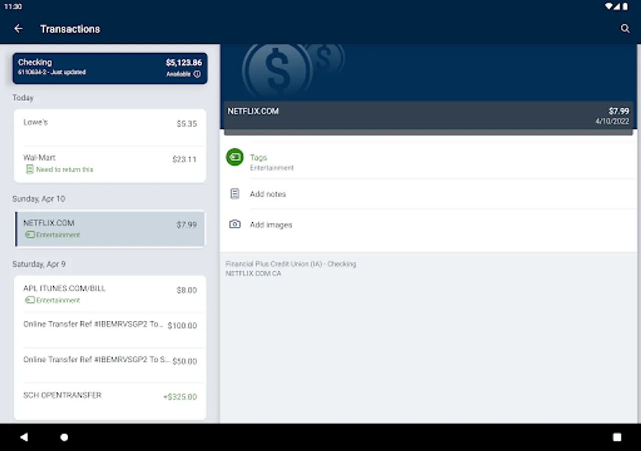 - Keep your transactions organized by allowing you to add tags, notes and photos of receipts and checks.