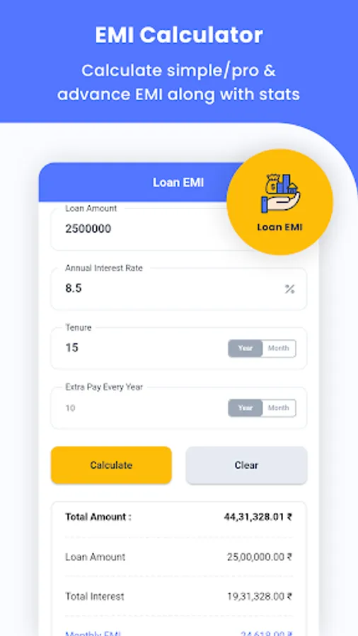 EMI Calculator is a simple loan calculation tool that helps the user quickly calculate EMI and view payment schedules. Use this app to calculate your EMI (Equated Monthly Installment), and plan your loan repayment in an effective way. You can easily compare multiple banks' loans by using EMI Calculator.