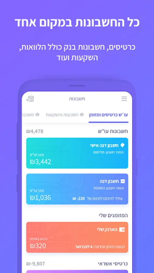 The Finanda app supports, among others, Discount Bank, Bank Hapoalim, Bank Yahav, Bank Leumi, Mizrahi Tefahot Bank, Mercantile Bank, First International Bank, Massad Bank, Otsar Hahayal Bank, Bank of Pagi, Isracard, ICL, Leumi Card, American Express and more A full list of supported sites can be found on our support page: https://www.finanda.co.il/support/#supported-institutes