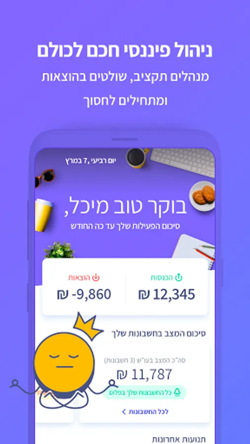 • Keep track of your bank accounts and credit cards - with the click of a button you can see your transactions and balances in various accounts, savings, investment loans and foreign exchange accounts (from supported institutions) and even get the total value!