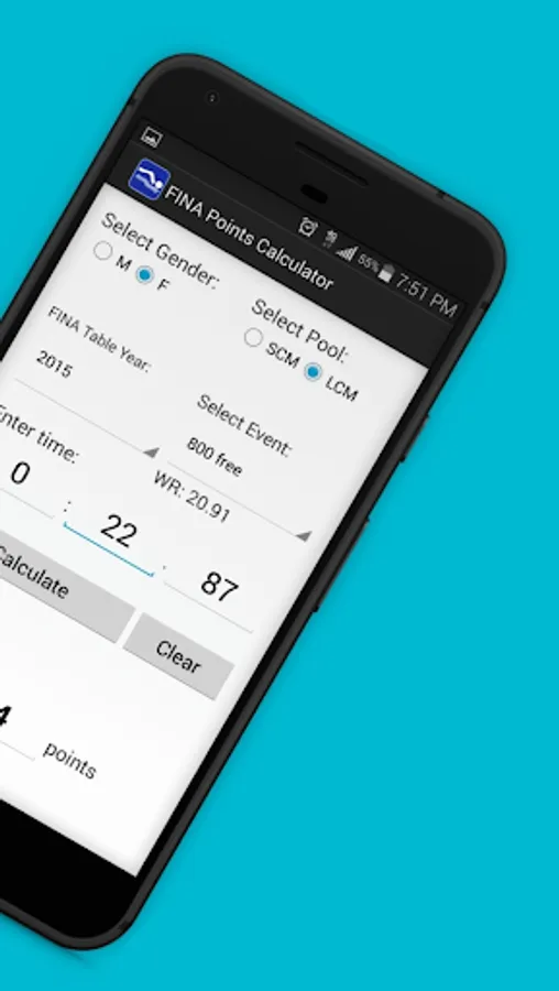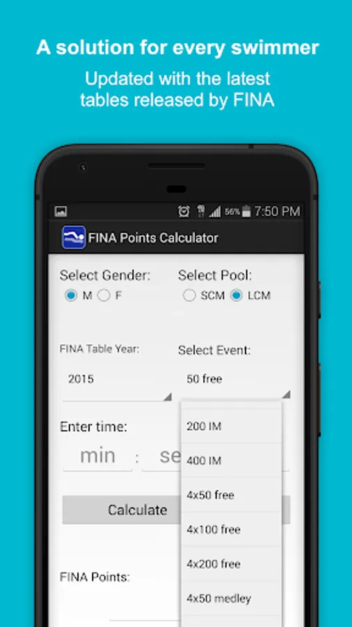 FINA Points Calculator helps you convert your time to official swimming power points and vice versa. Simply input your time, select gender, course, event, and hit "Calculate". It also works by entering the desired points to calculate your goal time.