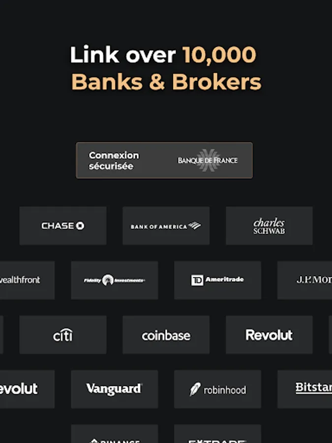 Finary is your personal wealth tracker, you can use it as a bitcoin tracker, a stock market tracker or a wallet tracker to follow coin, track wealth or visualize your portfolio charts. You can safely link over 20,000 Banks, Brokers, Crypto platforms and even track your Real Estate investments.
