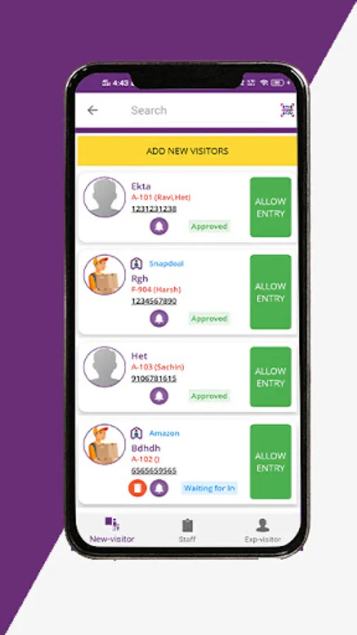 Gatekeeper Fincasys provides a digitalized way to process Entry & Exit of Resources, Visitors, Cab/Taxis, Delivery or Courier and completely synched with the Society Administrator & Residents User apps. The app has QR Code Scanner functionality, which helps to Scan the passes and Allow Visitors or Event attendees without any hassle and manual entry.