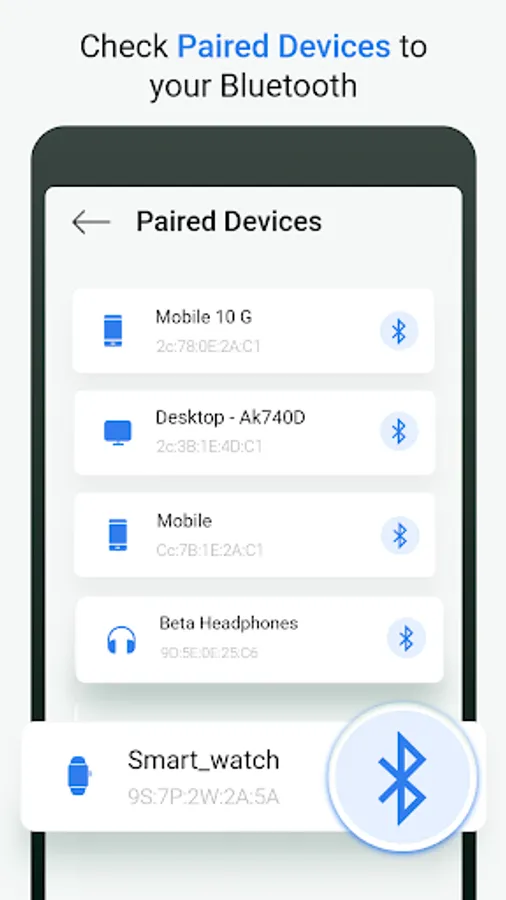Bluetooth finder displays all the details of your Bluetooth adopter installed on your mobile. You can view all essential information about your Bluetooth device in Find my bluetooth device headphones. You can find the Mac Address of your Bluetooth device in the Bluetooth device locator finder.