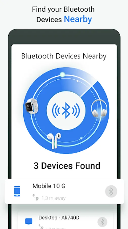 Bluetooth device finder scans for all nearby Bluetooth devices. Bluetooth device locator finder list out all the available nearby Bluetooth devices. Find my headset helps you to find earbuds, and connect to wireless headphones and Bluetooth speakers. Thus, Find my bluetooth device headphones track down any kind of Bluetooth device. With this Bluetooth device finder, you can find your lost Bluetooth devices as this Bluetooth device locator finder scans for all the nearby Bluetooth devices.