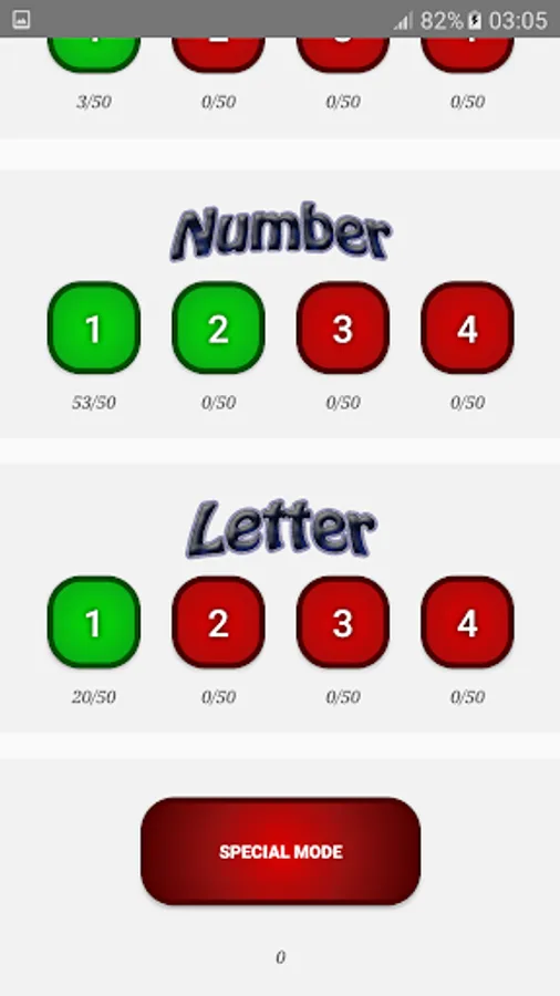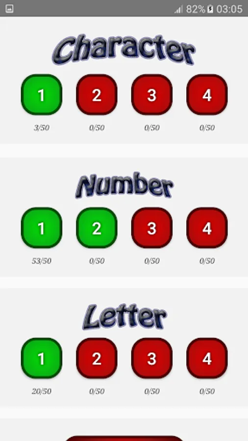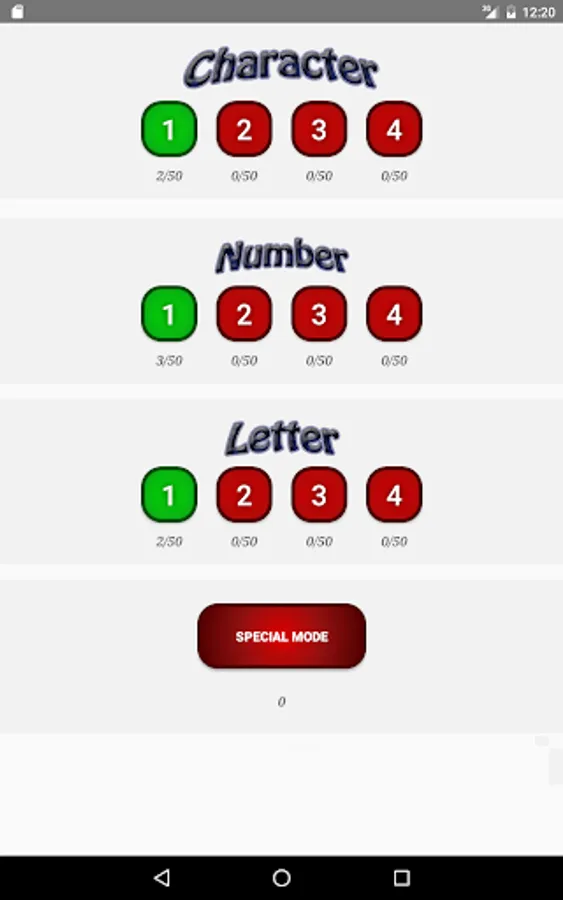The game consists of 4 stages. ( Character, Number, Letter and Special Mode )