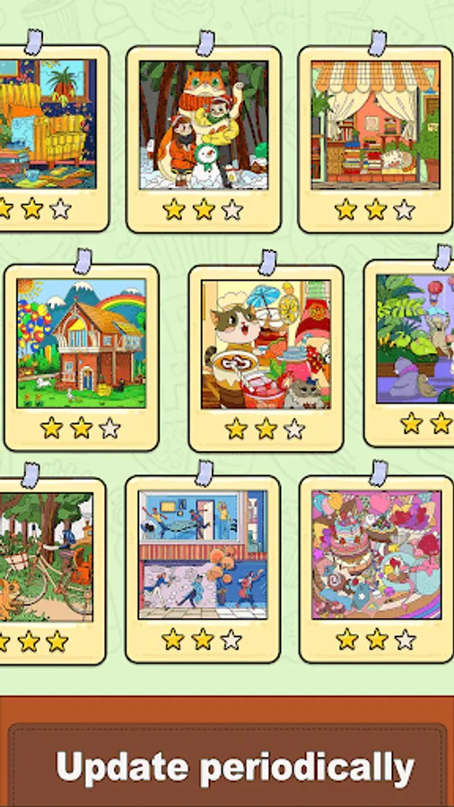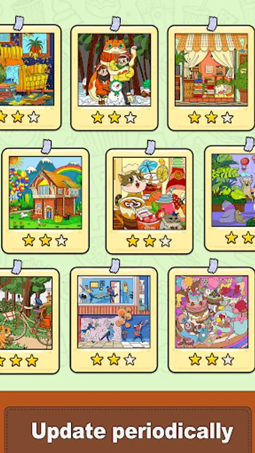 -Three main gameplays: Find the hidden pattern. Find differences and Jigsaw puzzle