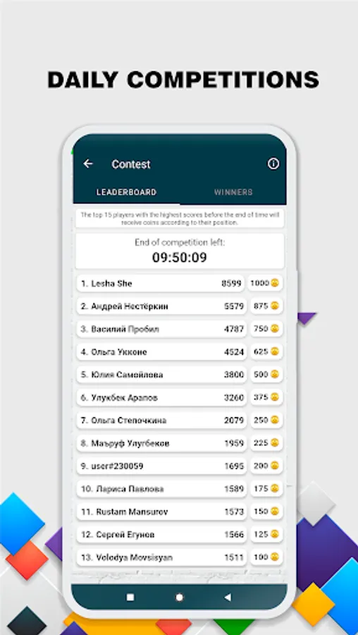 ✓ Daily tournament. Be in the "Top 15" on the Leaderboard and get coins as a gift.