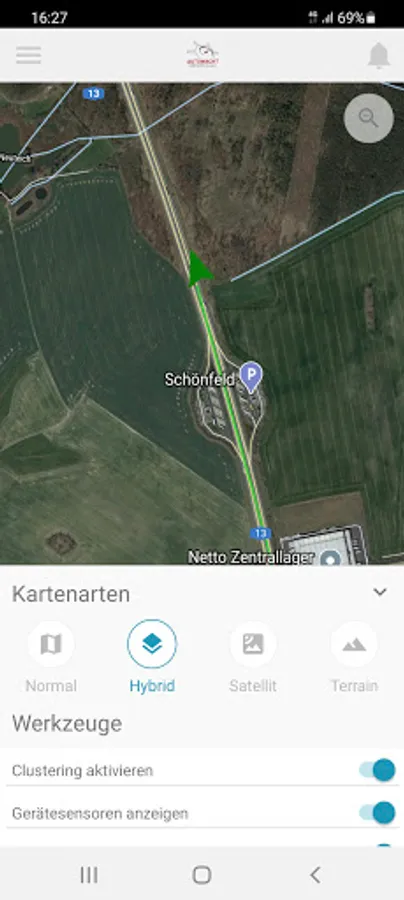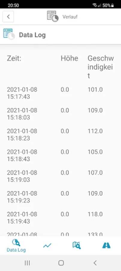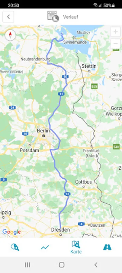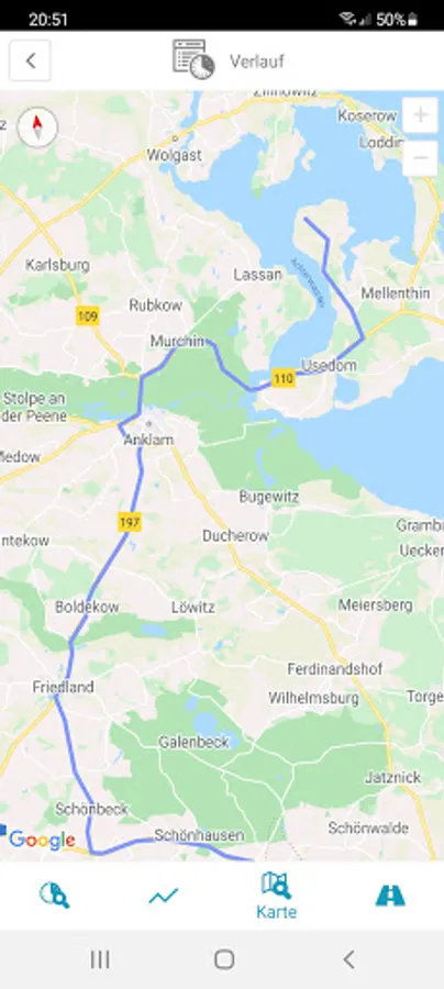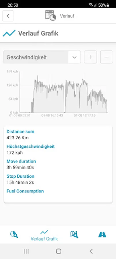 The recorded route is saved on the server and can be called up again at any time. Different export options show the distance covered, the speed, breaks, the fuel consumption and much more in tabular form or as a .kml file.