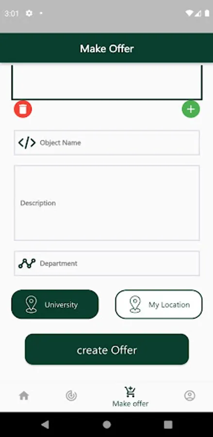 Home Page which has all departments, you can make an offer from Create Offer page to add new items and enter the owner's contacts and the description for this item.