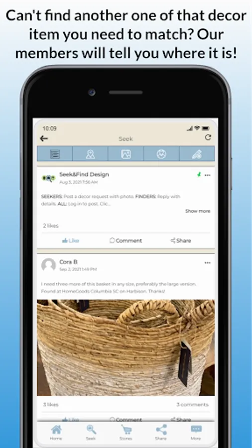 1. Seek: Ask our members for help finding decor. Simply post your request and members near your post location will reply.