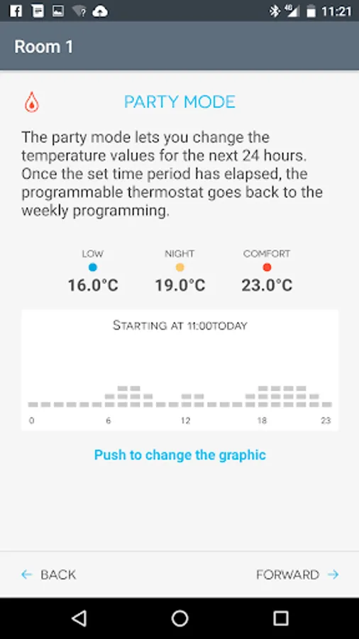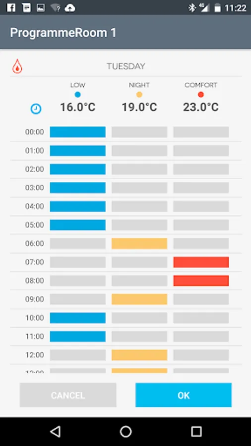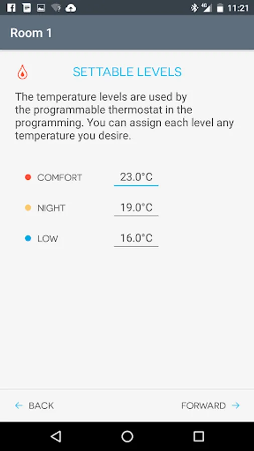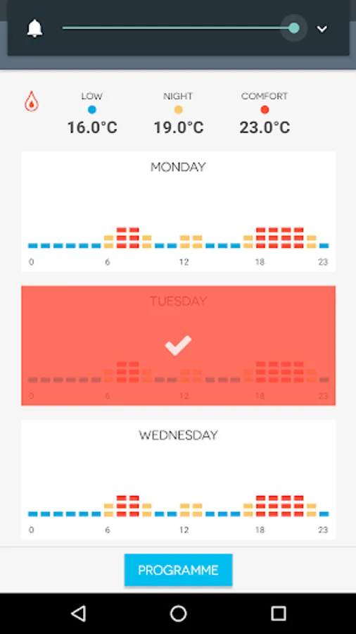 With the application, it is possible to programme the temperatures on a weekly basis, change the temperature programming for 24 hours, suspend the programme when you go on holiday, and regulate the temperature comfort levels.