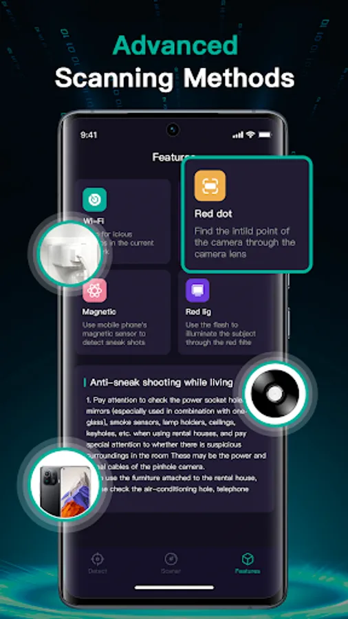 - Analyze the magnetic activity around the device, and app will remind you the suspicious devices as you close to them, and you'll find the hidden camera or spy devices 🤳.