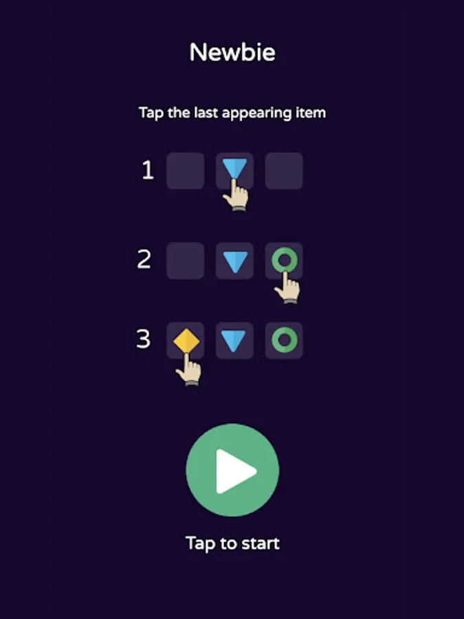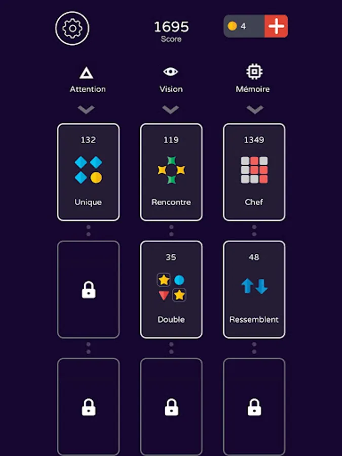 Each level tests your cognitive skills and mental abilities. You can track your progress after each level. Depending no your performance you can receive stars from 1 to 5. Completing each level with at least 3 stars will provide one golden coin.