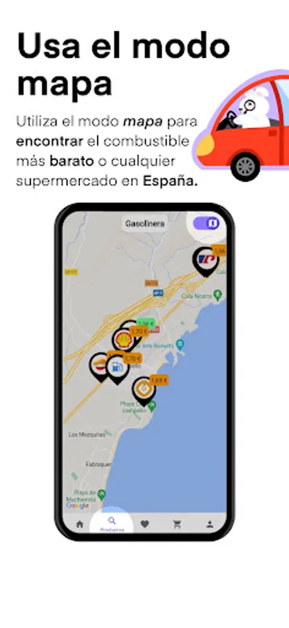 También contamos con modo mapa para que puedas encontrar más fácilmente las gasolineras y supermercados que te interesan.