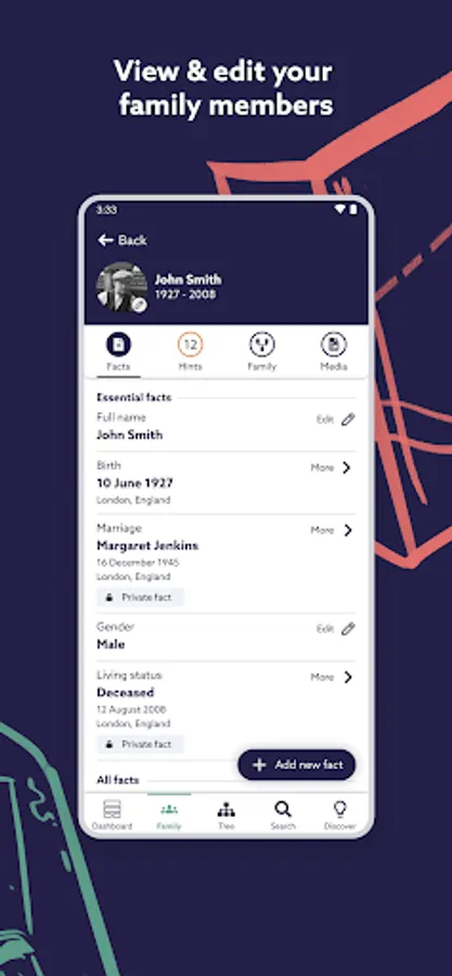 Upload snaps or a selfie from your phone. They personalise your family tree and help familiarise you with your ancestors.