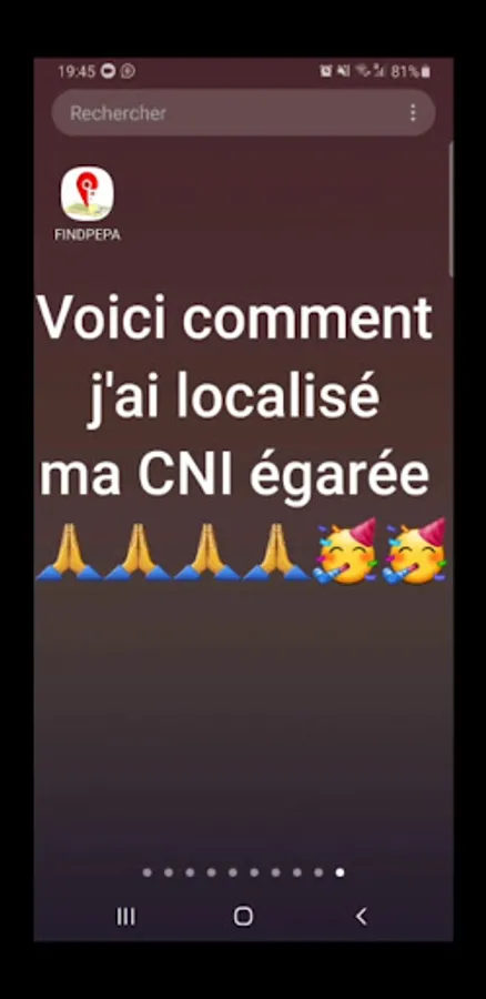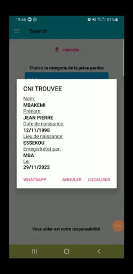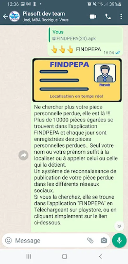 Ne chercher plus votre pièce personnelle perdue, elle est là !!! Plus de 10000 pièces égarées se trouvent dans l'application FINDPEPA et chaque jour sont enregistrées des pièces personnelles perdues .. Seul votre nom ou votre prénom suffit à la localiser ou à appeler celui ou celle qui la détient. Un système de reconnaissance de publication de votre pièce perdue dans les différents réseaux sociaux. nSi vous la cherchez, elle se trouve dans l'application "FINDPEPA" en Téléchargeant sur playstore, ou en cliquant simplement sur le lien ci-dessous.